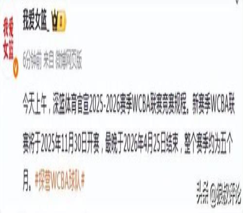北京时间10月13日,根据媒体人“我爱女篮”的报道,今天上午,深篮体育官宣2025-2026赛季WCBA联赛竞赛规程。新赛季WCBA联赛将于2025年11月30日开赛,最晚于2026年4月25日结束,整个赛季约为五个月。